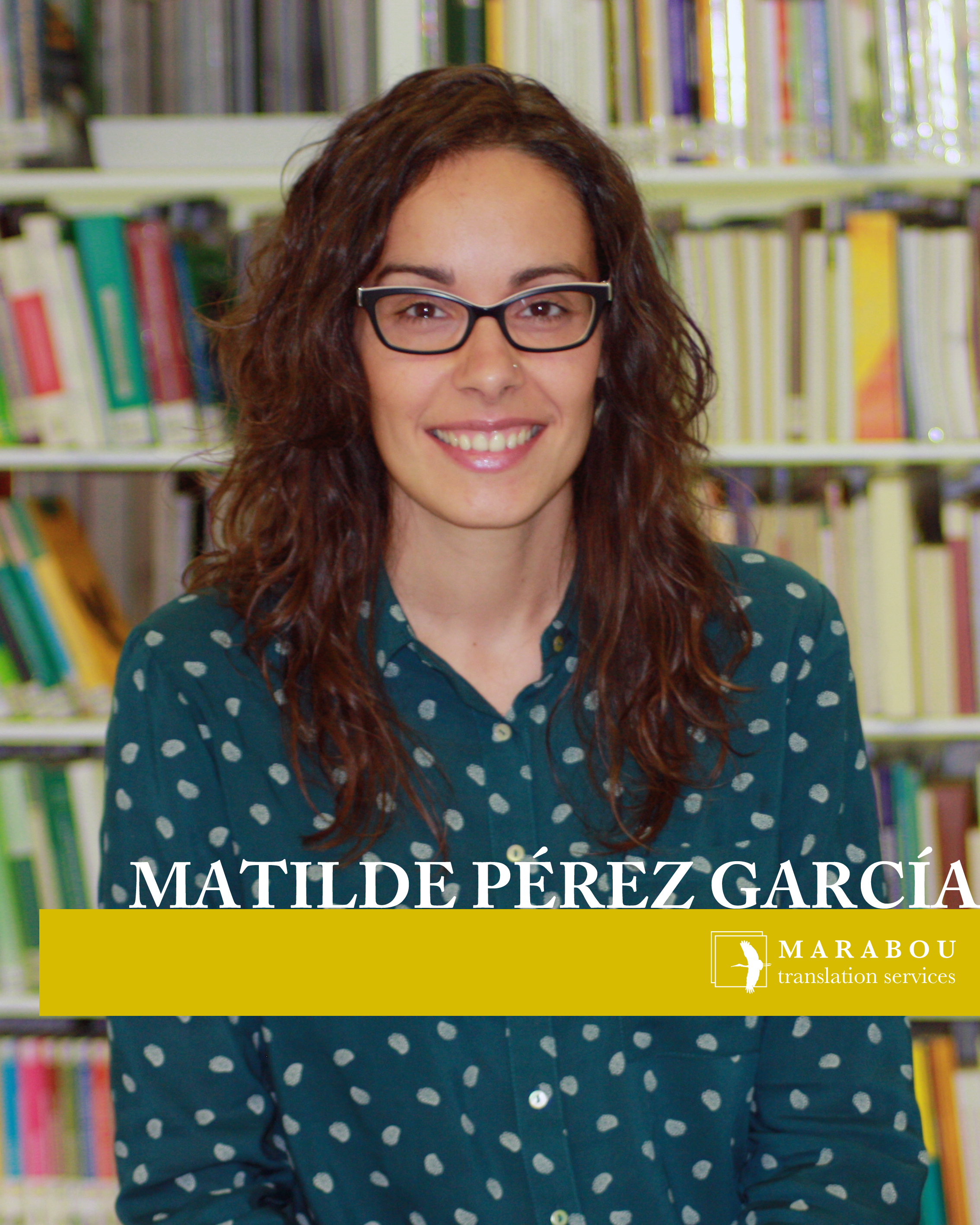 Cofundadora de Marabou Translations, es licenciada en Filología Inglesa por la Universidad de Murcia, licenciada en Traducción e Interpretación por la Universidad de Granada y acreditada como traductora jurada de inglés por el Ministerio de Asuntos Exteriores y Cooperación. Tras completar su formación en Inglaterra e Irlanda, lleva más de seis años dedicándose a la traducción y a la interpretación en diversos ámbitos: corporativo, legal, de organizaciones internacionales y cooperación internacional, de transcreación y marketing y literario. En la actualidad combina sus tareas como intérprete acompañante y traductora jurada con la traducción de narrativas de grandes autores de la literatura anglosajona. Destaca la traducción de obras de Henry James (Los matrimonios) y O. Henry como La voz de Nueva York y la recientemente publicada Rolling Stones, una selección de relatos del escritor norteamericano promovida, como las obras anteriores, por Ediciones Traspiés.
